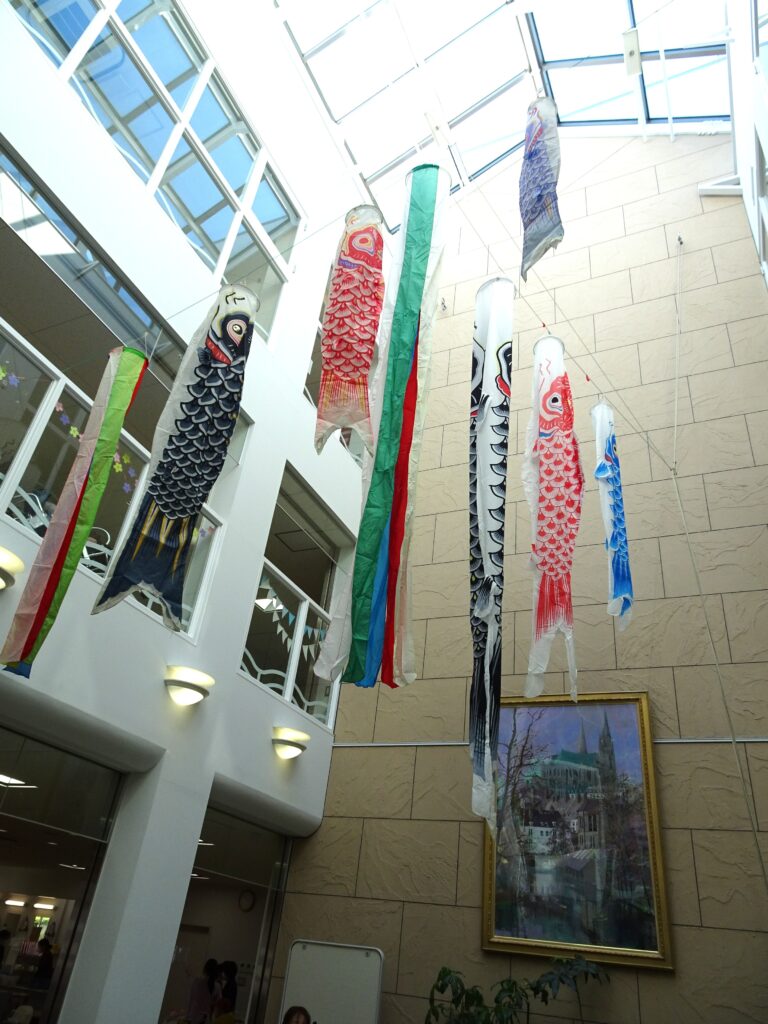 湘南の丘吹き抜けロビーでは、雄大な鯉のぼりが圧巻です。